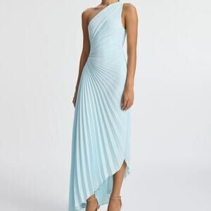 The Delfina Dress, a part of A.L.C.'s Signature Collection, is asymmetrically draped and pleated from our signature matte fabric in an aqua-blue hue. This one-shoulder silhouette features a confident side cutout and high-low hem. This style runs true to size