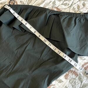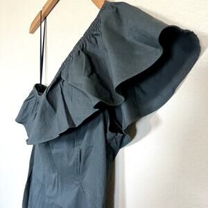One shoulder 'Evangeline' midi dress by A.L.C. Ruffle detail on the neckline with a trumpet midi length silhouette. Fabric is a woven with a touch of stretch. The color is a muted green that's difficult to capture accurately. Looks more like the stock photo. Please refer to photos for approximate measurements.
