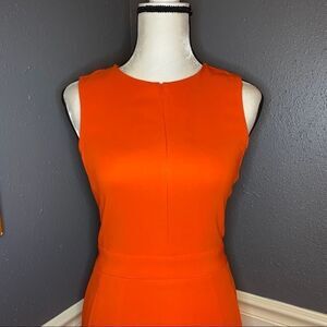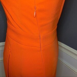 Stock photos look more of a true orange Self: 97% viscose, 3% elastane Contrast: 92% silk 8% spandex Lining: 95% poly 5% spandex Dry clean only Lined Front zip closure Side seam hidden zip closure Slit front pockets Back cut-out detail