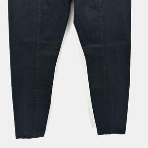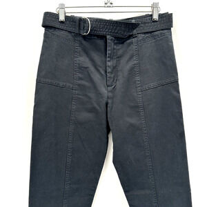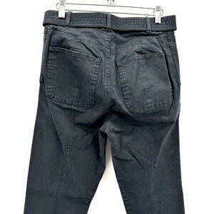 Excellent pre-owned condition. A classic ankle jean with an updated style. Belted with a silver toned D-ring, back patch pockets and welt seam detail. The perfect amount of stretch in this airy cotton fabric. High Rise. Deep black in color.