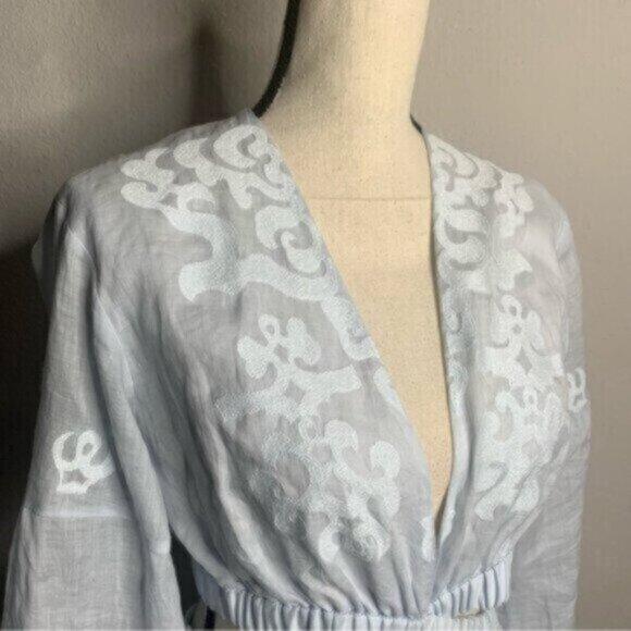 A.L.C. Irene Embroidered Mini Dress This light blue mini dress exudes an ethereal and bohemian charm, perfect for a breezy, effortless look. It features a deep V-neckline that elongates the torso and draws attention to the delicate embroidery adorning the bodice. The long, billowy sleeves add a touch of romance and volume, while the cinched cuffs provide a tailored finish. Crafted from a lightweight, semi-sheer fabric. The intricate white embroidery creates a striking contrast against the soft blue backdrop, adding a touch of artisanal craftsmanship to the design. A unique cut-out detail at the waist, accentuated with elastic gathers, enhances the silhouette by highlighting the midsection and creating a flattering, hourglass shape. The skirt flares out into a playful A-line, offering both comfort and style. Brand: A.L.C. Color: Ice Water | Light Blue Size: 8 NEW WITH TAGS REASONABLE OFFERS WELCOMED Smoke and Pet Free Home HELP ME DOWNSIZE MY CLOSET TAGS: Clean Beauty | Little Black Dress | Cocktail | Date Night | Summer | Spring | Elegant | Brunch | Special Occasion | Dinner Date | Girls Night Out | Minimalist | Vacation | Tropical | Cruise | Bridal Shower | Glam | Party Dress | Contemporary | Runway | Luxury | Designer | Sleeveless | Fit & Flare | Mini | Boho | Bohemian | Long Sleeve | Cruise | Beach | Tropical | Celeb Styles | Classy | Elegant | Cut Out Back | Rehearsal