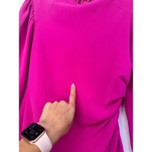 Pink crepe (63% Triacetate, 37% Polyester). Sheath. Long sleeves. Crew neckline. Hidden back zipper with hook-and-eye closure. 32" from shoulder to hemline. Imported.