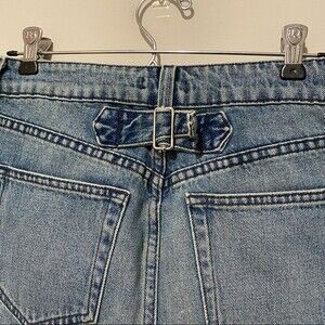 Features: cropped length, exposed button fly with silver buttons, 100% cotton, stiff or rigid denim, made in the USA, high waisted or high rise, pockets, adjustable buckle detail in the back