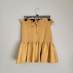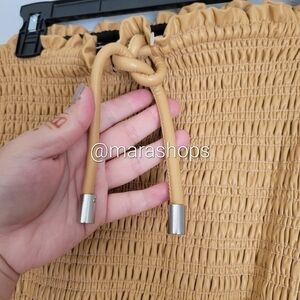 Allover smocking enhances this vegan leather drawstring miniskirt.