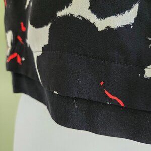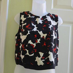 A.L.C. Joan Floral Cropped Sleeveless Silk Blouse Size 6 - excellent preowned condition, minimal wear, on the front there's a white stripe as shown on the black edge. Scoop neck, sleeveless, cropped style blouse top. Made of 100% silk, designer luxury piece. Versatile for casual, work attire, or formal wear. Zipper back. Double layer detail at hem. Black, white, and an orange/red color floral print all over. Art deco avant garde vibes. Preppy chic.
