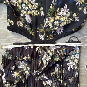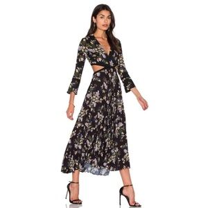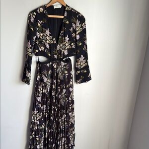 Angular cut-outs wrap around the waist and divide the bodice from the pleated skirt on this A.L.C dress. A classic floral print covers the piece, which is styled with a plunging V-neckline and bracelet length bell sleeves.