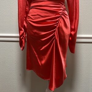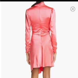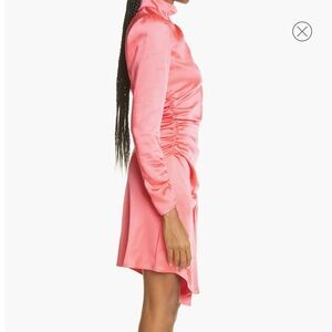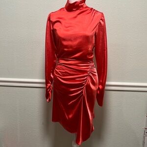 Channel contemporary glamour in this long-sleeve mock-neck minidress featuring asymmetric styling and ruched details.