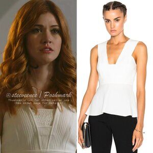 A.L.C. Leigh Top in White as seen on Clary Fray (Katherine McNamara) in Shadowhunters season 2 episode 5 (2017). Same style, brand and color. The black version was seen on Rebekah Mikaelson (Claire Holt) in season 4 episode 3 of The Originals.
