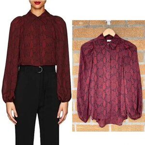A.L.C Red and Black Lori Snake Print Blouse. A cool snakeskin print gives a sultry look to this silk blouse. Spread collar. Pintucked pleats at shoulders. Concealed front button placket.