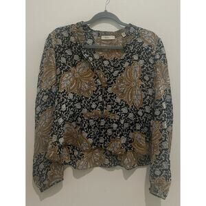 A.L.C., size 4, silk blouse with neutral colored print and slight flattering peplum style hem. Good, preowned condition!