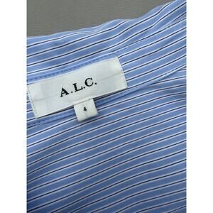 The A.L.C. Madison Shirt Dress in size 4 is a stylish and versatile piece for women. This blue and white striped dress features an asymmetrical long sleeve, collared neckline, and button closure. Made from 100% cotton, the dress is perfect for the summer, fall, and spring seasons. With its wrap dress and shirt dress style, this A.L.C. dress has a preppy and designer theme, ideal for those looking for a pinstripe or shirtdress vibe. The belted waist adds a touch of elegance to this wardrobe essential.