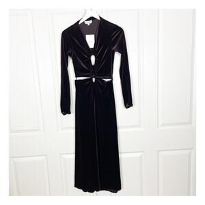 “java brown” Maeve V-neck Keyhole and Cut Out L/S Velvet Dress from A.L.C. two round keyholes on front and side/ back cut outs. 91% poly 9% elastane. **new with tag but one of the interior loops used for hanging dress is missing.