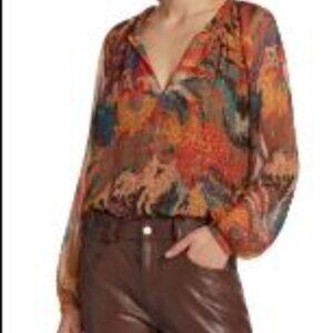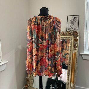 A.L.C. Metallic Floral V-Neck Silk Tunic Blouse Long Sleeve Size 8 Multicolor