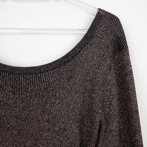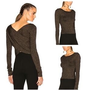 A.L.C. Size L. Black, Brown/Bronze. Metallic. Long Sleeve. Wide Scoop Neck. Long Sleeve. Ribbed Knit. V-Shaped Criss-Cross Back. High-Low Hem. Cropped Length. Merino Wool Blend. Dry Clean.