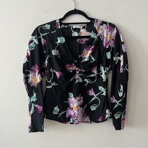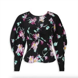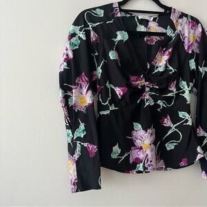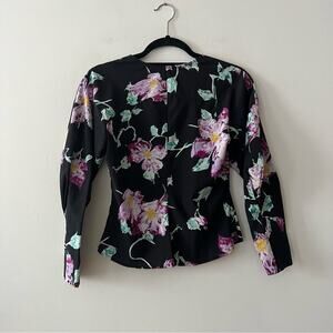 "Flawlessly tailored from stretch silk fabric, it features an abstract floral pattern, classic gigot sleeves, and a gathered detail at the center of the bodice." In good preowned condition. Hidden side zip.
