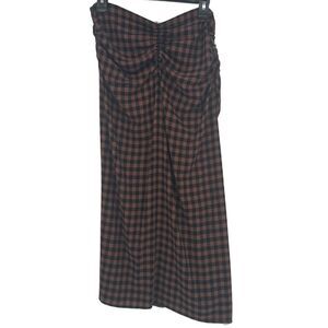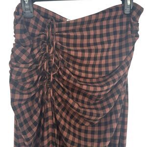 For sale is this A.L.C. Orly Ruched Checked Crepe Midi Skirt Blackbrandy Brown Size 10 Women's. This skirt is new without tags and features a hidden side zipper closure, adjustable ruched front, and is made from an unlined lightweight fabric.