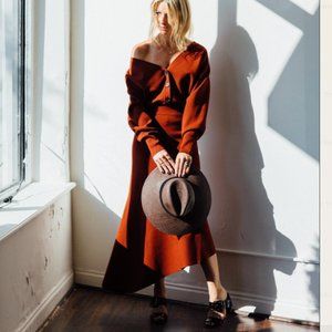 A.L.C's Peters cardigan in color Sumac is a line staple. Loved for its relaxed fit and dolman sleeve with cinched cuffs and waist for a blouson sleeve effect. Featuring a V-neck, ribbed trim and button placket. The rich cognac color evokes a sense of fall and leaves turning a gorgeous rust color before blanketing the ground. So easily paired with almost all of falls fabulous fashions, the deep earth tone is extremely versatile, worn open as a sweater or jacket, worn buttoned up or off the shoulders, over a tank or a dress, the options are endless. This is the type of classic piece you splurge on when creating a capsule wardrobe for fall! The amount of times you can wear this and create something new, it will be worth every penny and then some! 🥂