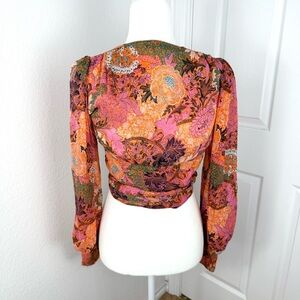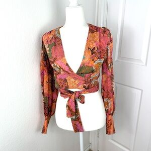 This A.L.C. blouse showcases a captivating pink and orange floral pattern, enhanced by its elegant wrap and tie front design. The full-length sleeves and flowy fabric add a touch of sophistication, making it a versatile addition to any wardrobe.