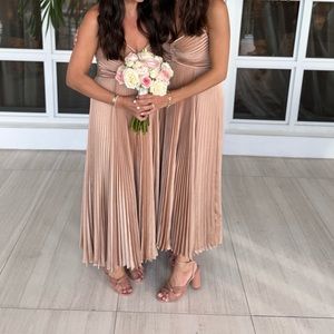 Elegant pleated ALC midi/maxi dress in gold. Spaghetti strap with a lovely fit and pleated satin to be flattering on all body types. Perfect for special occasions. Worn for a bridesmaid dress 1x by me, and reposhing from someone who wore it as a bridesmaid dress 1x before that.