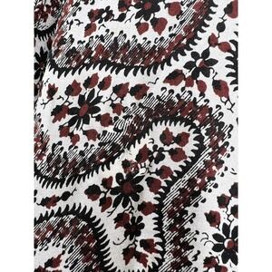 A classic handkerchief pattern takes on a psychedelic spin on this collarless button down mini. Long sleeves balance the short hemline, which takes a subtle dip in the back. Color: Red Multi. 100% Silk.