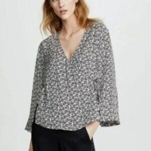 Brand new with tags, the A.L.C. Ray blouse features a striking black and white floral print on luxe silk. Designed with a wrap front and voluminous bell sleeves, it offers a flattering silhouette with modern edge. Lightweight and fluid, it transitions effortlessly from day to evening.