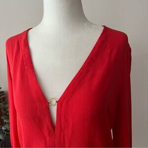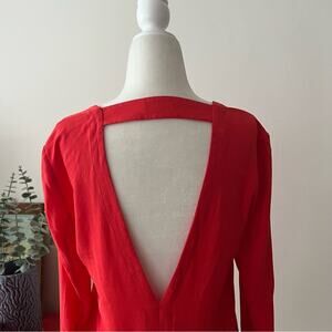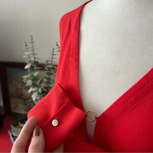 In good pre-owned condition. I had a tailor add a cute little metal ring to keep the neckline more together but unfortunately, they did choose a gold ring and the snaps on the sleeves are silver toned. Not really noticeable imo. Cutout at the back.
