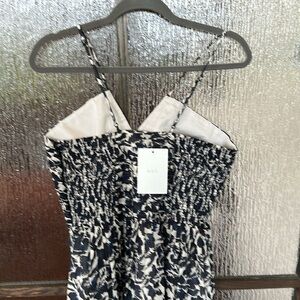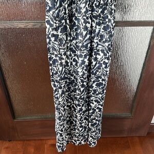 This elegant navy and cream maxi dress is perfect for any occasion. Its flowing design and intricate pattern offer a sophisticated look. Ideal for both casual and formal events.