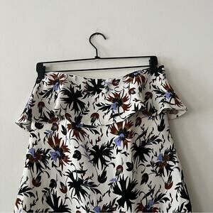 In good preowned condition other than a small spot on the front and a faint run in the silk. Flounce detail. 100% silk.