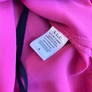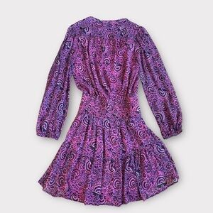 NOTES: Silk abstract print mini-dress with a smocked waist and pleated flounce hem.