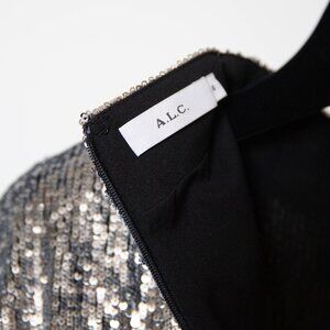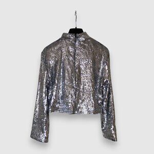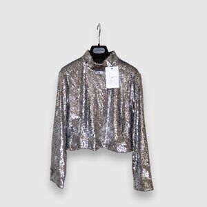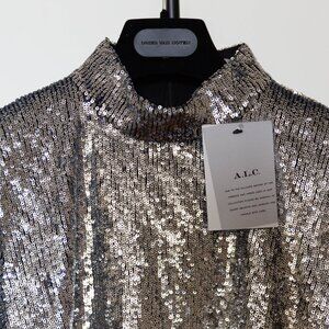 Silver A.L.C. long sleeve crop top with sequin accents throughout, mock turtleneck and concealed zip closure at nape.