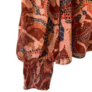 Stunning Bold Print Lightweight pullover style blouse featuring long blouson sheer sleeves, front keyhole with loop button closure, smocked collar, smocked cuffs, smocked shoulder, side slits, partially lined and metallic threading.