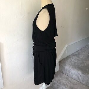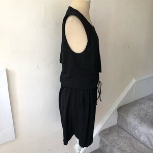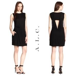 An inset panel and cutout detailing lend a layered look to a casual jersey A.L.C. dress. An elastic waist adds volume to the blouson bodice with dual slit pockets at hips. Sleeveless, scoop neck. Size not listed, should fit a small, estimated from measurements: