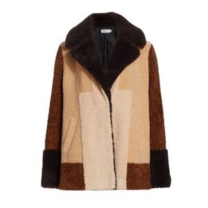 Beautiful stylish and cuddly A.L.C. Stefan faux fur teddy coat with cuffed sleeves. Spread color. Long sleeves. Hook and eye closure. Welt pockets. patchwork design. Lined. Size M