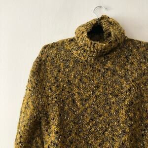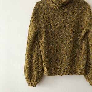 A gorgeous slubbed knit sweater with blouson sleeves and ribbed edges. Waist-length style. Turtleneck. Italian yarn made from 41% merino/29% nylon/12% cotton/11% mohair/7% acrylic. In good preowned condition.