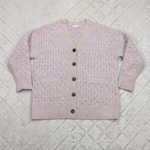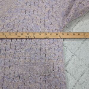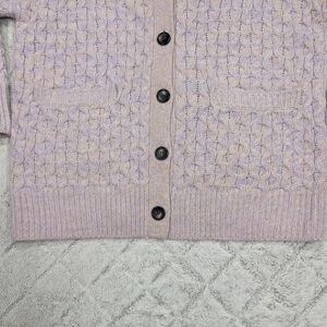 Gently Pre-Owned. Good condition. No flaws. Made from lavender marled 100% wool yarn with a textured honeycomb cable knit design. Has some peachy and off-white colors mixed in. Relaxed, boxy oversized style. Long sleeves with ribbed cuffs and bottom. V-neck style cardigan with contrasting black button front closure. Two open front pockets.