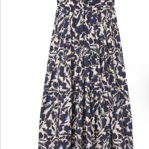 The Tate Dress is crafted from printed cotton poplin in a graphic navy and cream floral print. This strapless silhouette features pleating and gathering with side smocking and a full midi skirt. Thoughtful details like pockets and grip lining at the bodice complete the look—an ideal piece to pack for warm-weather winter getaways. This style runs true to size.