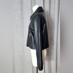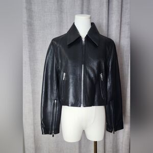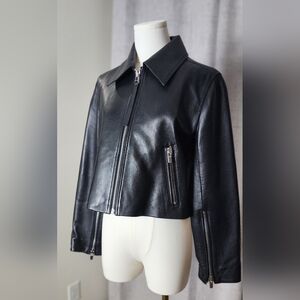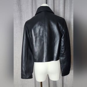 Elevate your style with this sleek black leather jacket. Perfect for any occasion, this jacket offers both comfort and sophistication.