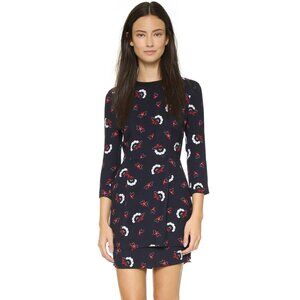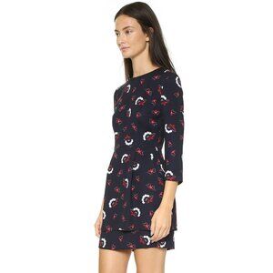 "An abstract botanical print accents this silk crepe A.L.C. dress. Contrast trim details the crew neckline, an a peek-a-boo hem relaxes the fitted profile. Slant side pockets. Hidden back zip. 3/4 sleeves. Unlined. Silk crepe. 100% silk. Dry clean."