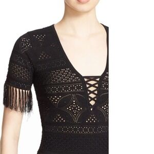 Intricate crochetwork creates a striking peekaboo effect on a short-sleeve sheath fashioned with corset-style lacing at the neckline and a swath of fringe around each sleeve for a look that's both bohemian and contemporary.