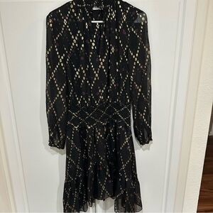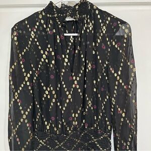 A.L.C. Tula Black Gold Metallic Dress, Silk Blend, Smocked Waist, Long Sleeves, Lined skirt, black semi sheer fabric with shiny metallic gold throughout and a circular blue, red and black design to add a little visual interest. Mock neck that can be worn buttoned or open. Blouson sleeves, elasticized waistband and shark bite/handkerchief hem.