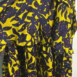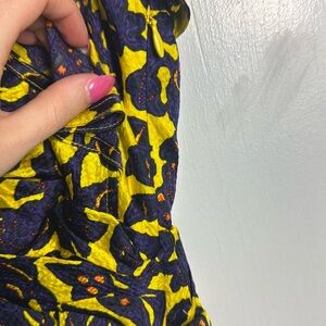 Yellow and blue bloom print baby doll mini dress with plunging neckline, flutter cap sleeves and tiered ruffle hemline. In great condition.