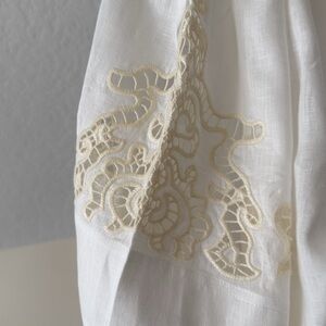 Elegant ivory linen blouse featuring delicate lace accents. Relaxed fit with short sleeves.