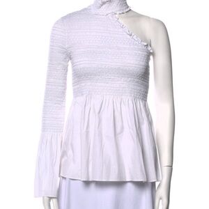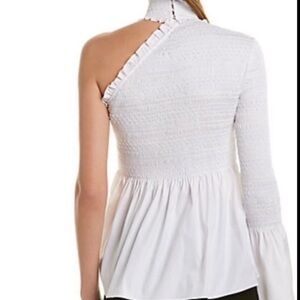Elegant one-shoulder design. Features ruffled neckline. Long sleeve with flared cuff. Perfect for chic occasions.