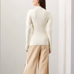 Dramatic statement piece with a two way zipper detail in a luxury ribbed knit bodycon fit, mock neck design. versatile basic that can go from work to happy hour, fitted sweater.