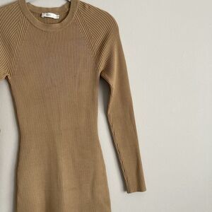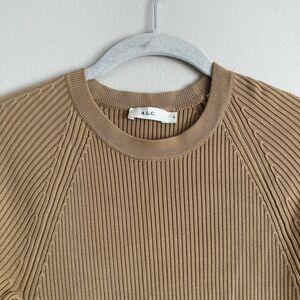 ALC Womens Long Sleeve Ribbed Dress Light Brown Size Small Party Going Out. ALC womens dress. Crewneck. Long sleeves. Ribbed. Rayon, nylon and elastane fabric blend. Tan/light brown/beige. Size small. Measured laying flat: 12 inches from pit to pit without any stretch, 30.75 inches long from top of tag to hem.