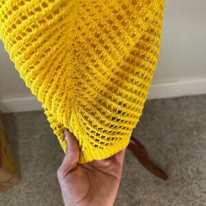 Round neckline. Fully lined. Pull-on styling. Midweight open crochet fabric.