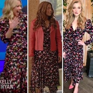 Asymmetrical flutter, puff-sleeve wrap dress. The colors are gorgeous and it’s 100% silk. Very chic on. Approx. 52.5" shortest length, 54.5" longest length. It does run small in the chest area.