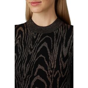 Black and gold printed woven (53% Viscose, 41% Polyester, 6% Metallic). Sheath. Three quarter sleeves. Crew neckline. 34.5" from shoulder to hemline. Imported.