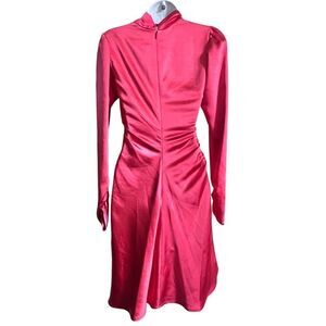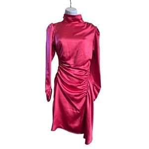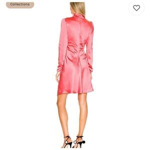 New with tags A.L.C. Mini dress in hot coral pink color. Long sleeve with slight puff at the shoulder, high neck, and asymmetrical hem with gathered detail in front and back. Small snags on one shoulder but not really noticeable due to gathered puff detail.