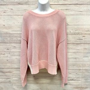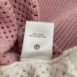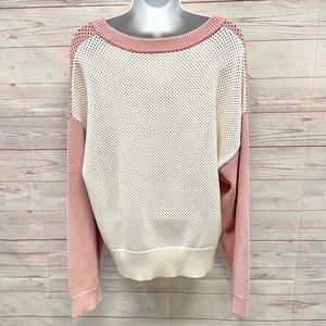 Knit with a delicate mesh-like texture, this draped pastel color-blocked sweater combines understated elegance with off-duty charm.
